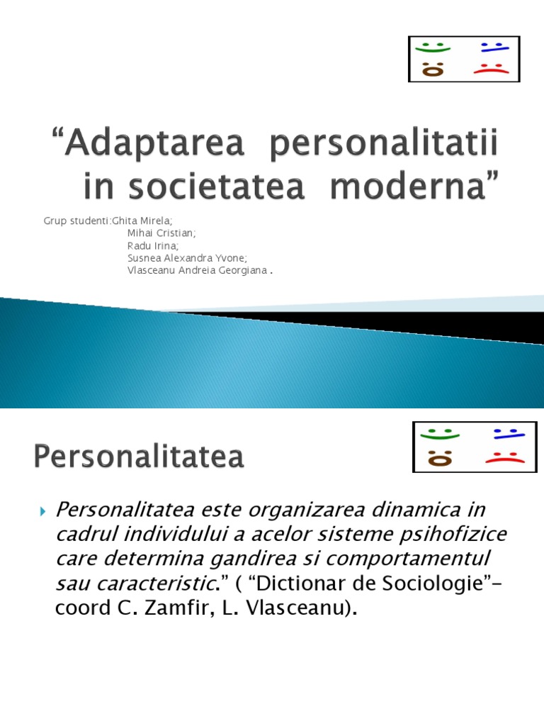vizitati articolul complet aici : https://parohiatorrent.wordpress.com/2012/09/21/familia-crestina-in-societatea-secolului-xxi/ Defectele din educaţia primită în alte instanţe de socializare. Ca si adaptare la limba romana am gasit o definire a copingului la traducerea cartii lui serban ionescu (2007). Introvertii, din contra, sunt rezervati pasivi, nesociabili, si deseori intampina dificultati de adaptare sociala.